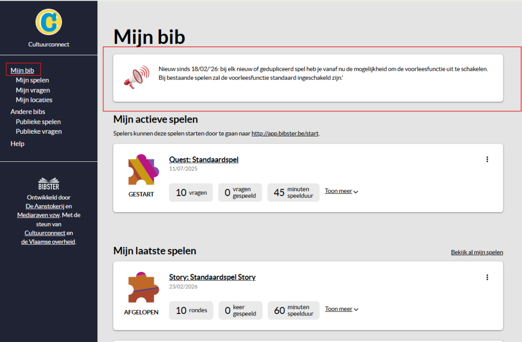 Naast jouw actieve spelen, laatste spelen en laatste vragen vind je op deze pagina van de backend de aankondiging van een nieuwe release met de releasedatum. Zo ben je altijd op de hoogte van de datum (en het tijdstip) waarop Bibster (tijdelijk) niet beschikbaar zal zijn.