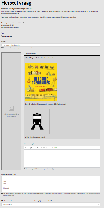 - Herstelflow voor vragen met meerdere afbeeldingen: In de nieuwe versie kan elke vraag, los van het vraagtype en los van het aantal afbeeldingen in een antwoord, nog maar één afbeelding bij de vraag bevatten. Wil je bestaande vragen met meerdere afbeeldingen hergebruiken, dan kom je in een automatische herstelflow terecht waarmee je je vraag kan aanpassen zodat je nog één afbeelding in een vraag overhoudt.