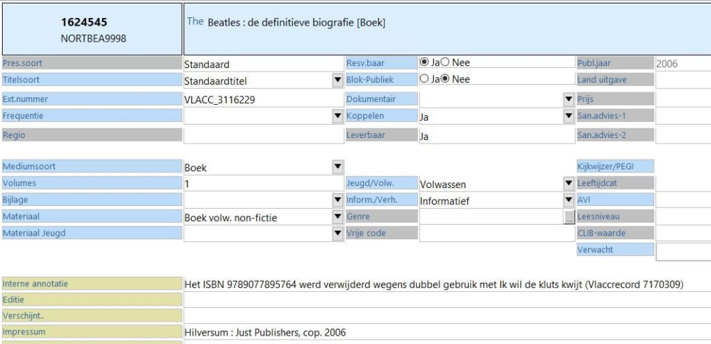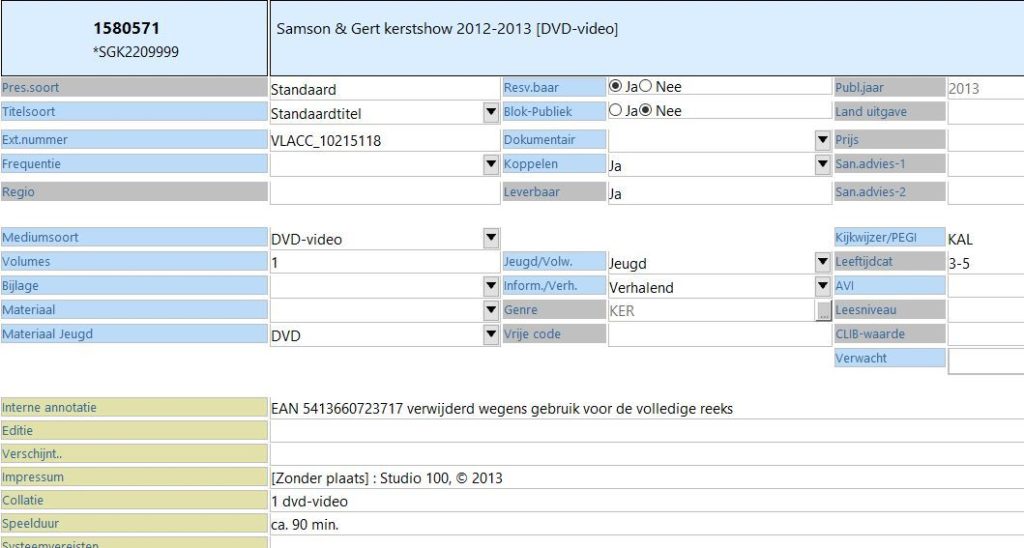 Indien eenzelfde ISBN aan alle onderdelen van een reeks wordt toegekend, dan nemen we dit ISBN in alle onderdelen op in het ISBN-veld, maar specifiek in het subveld z (Ongeldige ISBN), met de mededeling in interne annotatie (599): “ISBN 978x in subveld z geplaatst wegens gebruik voor de volledige reeks”