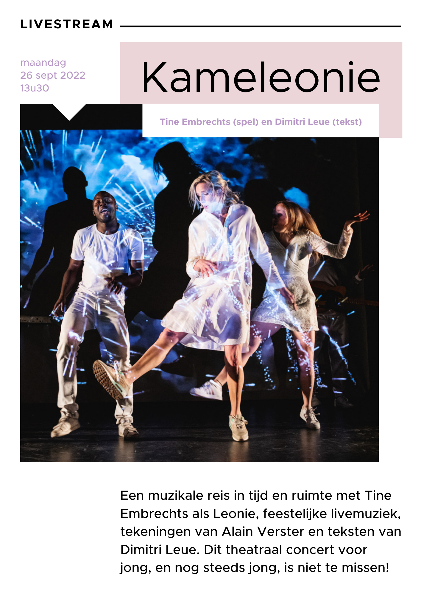 Hier vind je per voorstelling grafisch materiaal, templates en voorbeeldteksten om de livestream bekend te maken bij bewoners van (woon)zorgcentra, patiënten en hun familie in ziekenhuizen. Je kan ze gebruiken in je verschillende communicatiekanalen: nieuwsbrieven, sociale media, presentatiedagen, brochures, flyers, deurhangers … en via partnercommunicatie.
