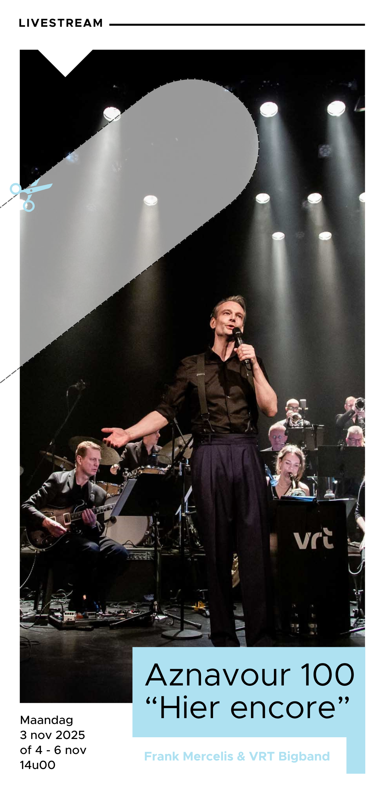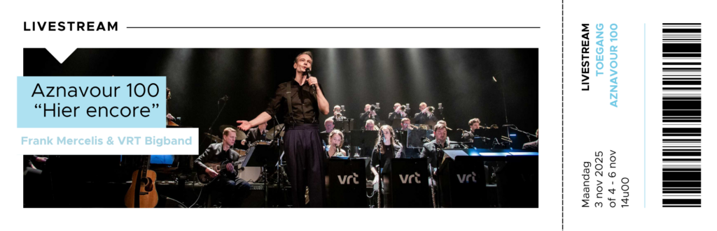 Charles Aznavour, één van ’s werelds grootste entertainers met een palmares van meer dan 1200 chansons, is niet weg te denken uit de muziekgeschiedenis. Op 22 mei ‘24 zou hij 100 jaar geworden zijn. Deze herdenking is voor Frank Mercelis en de VRT Bigband dé gelegenheid om de handen in elkaar te slaan.Voor Frank is dit project een persoonlijke droom. De muziek van Aznavour is een onuitputtelijke inspiratiebron voor zijn eigen chansoncollectief Eddy et les Vedettes. De VRT Bigband blinkt al meer dan een decennium uit in veelzijdigheid en enthousiasme om nieuw repertoire te ontdekken.