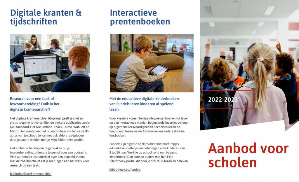 Laat aan leerkrachten weten welke digitale diensten je aanbiedt. Deze drieluikfolder stel je zelf samen in de gratis tool Canva naargelang het aanbod van je bib (kies uit: Fundels, Krantenarchief, Bieblo, Bibster). Foto’s en basisteksten staan voor je klaar. Vul aan met jouw andere scholenaanbod en de contactgegevens van je bibliotheek (mailadres, QR-code, url, logo).
