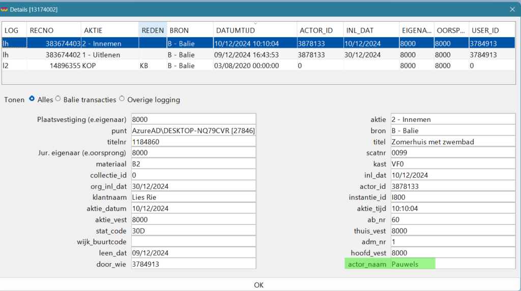 Sinds Wise versie 8.0.0 (januari 2025) wordt bij uitlenen en innemen nu ook de naam (‘actor_naam’) en het actor-ID (‘door_wie’) gelogd van de baliemedewerker die deze actie heeft uitgevoerd. Opgelet! Enkel de achternaam wordt weergegeven. Aangezien dit ook medewerkers uit andere instanties kunnen zijn met dezelfde achternaam, kijk je best ook naar de vestiging waar de actie is uitgevoerd om verwarring te voorkomen.