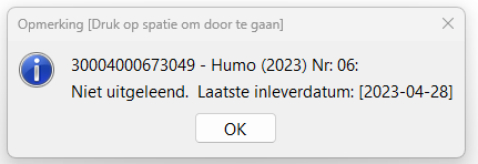 Na het innemen verschijnt een melding dat het exemplaar niet is uitgeleend.