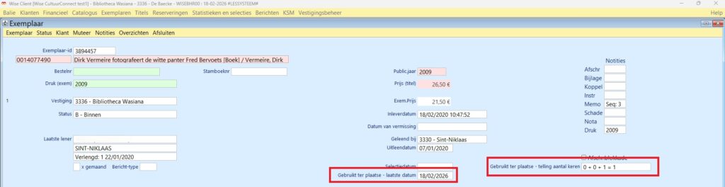 Er zijn twee nieuwe velden in het exemplaardetailscherm, gerelateerd aan Gebruikt ter plaatse: de laatste datum en de telling.