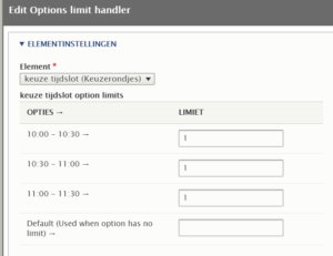 • Selecteer bij ‘Elementinstellingen’ het juiste keuze-element en vul het totaal toegestane aantal in.
