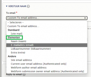 • De indiener: Wil je de bezoeker een bevestiging sturen? Kies ‘Elementen’ in de dropdown en selecteer het formulierveld waarin de bezoeker zijn e-mailadres invult.