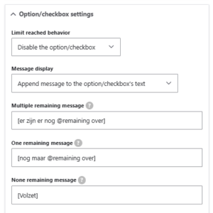 • Beschikbaarheid tonen: Via ‘Option settings’ kun je instellen of bezoekers zien hoeveel plaatsen er nog vrij zijn (Message display). Pas de tekstjes aan naar wens en maak hierbij gebruik van de parameter @remaining (deze haalt telkens het overblijvende aantal op).