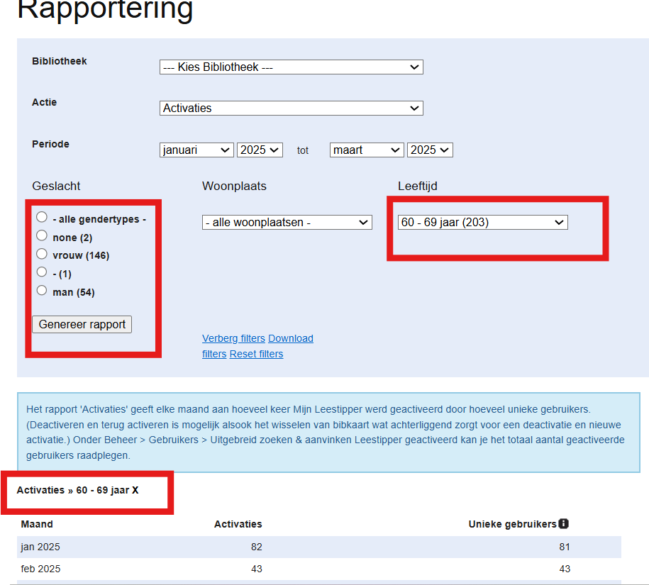 Wil je bijvoorbeeld alle specifieke data zien voor de leeftijdsgroep 60-69 jaar? Duid deze groep dan aan onder ‘Leeftijdsgroep’ en klik vervolgens op ‘Genereer rapport’.
