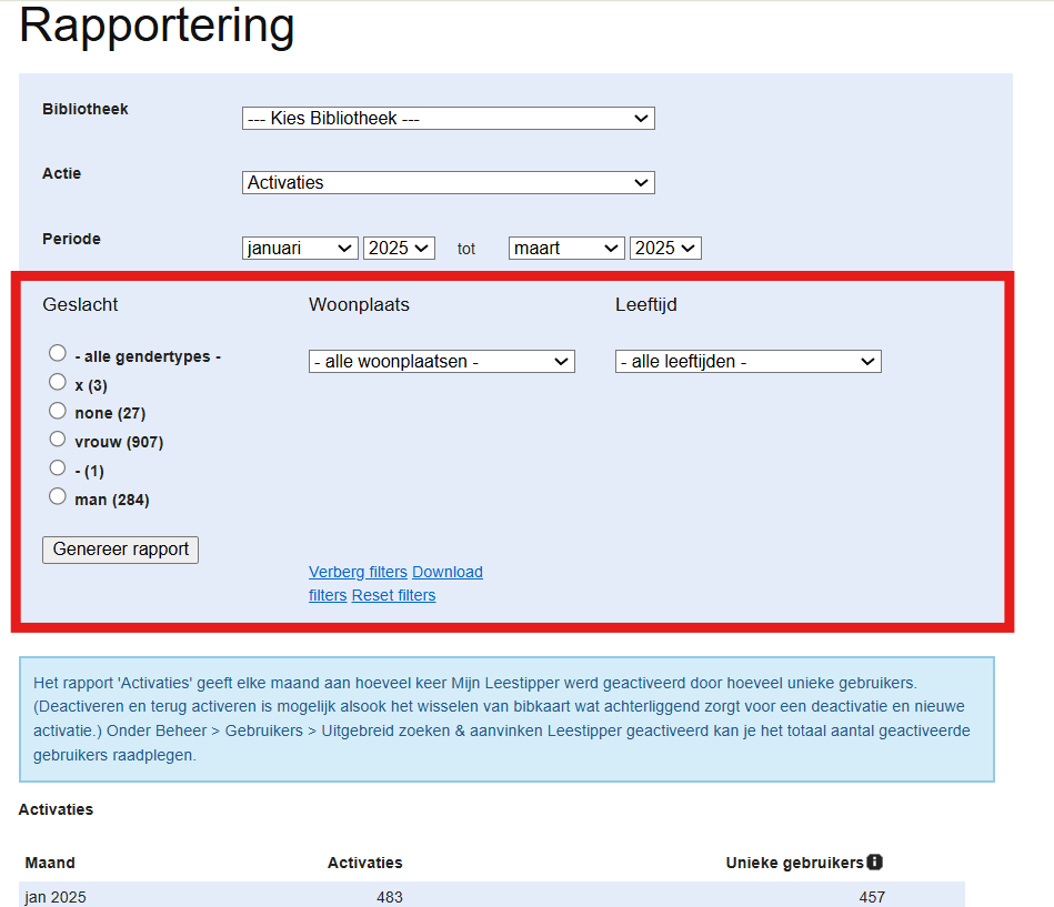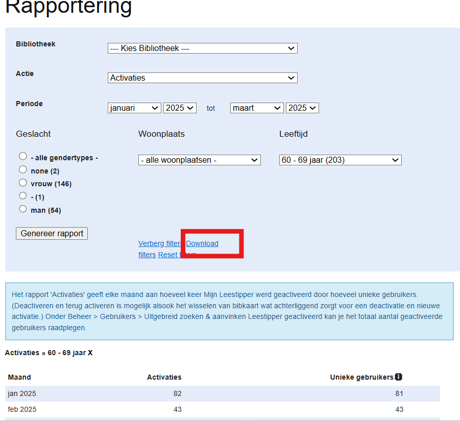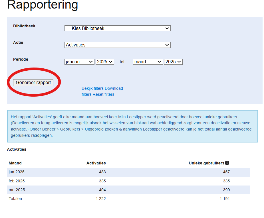 Stap 4. Je krijgt nu een overzicht van de algemene gebruikscijfers: het aantal gebruikers dat Mijn Leestipper geactiveerd heeft per maand en het aantal unieke gebruikers tijdens die maand (en de volledige geselecteerde periode).