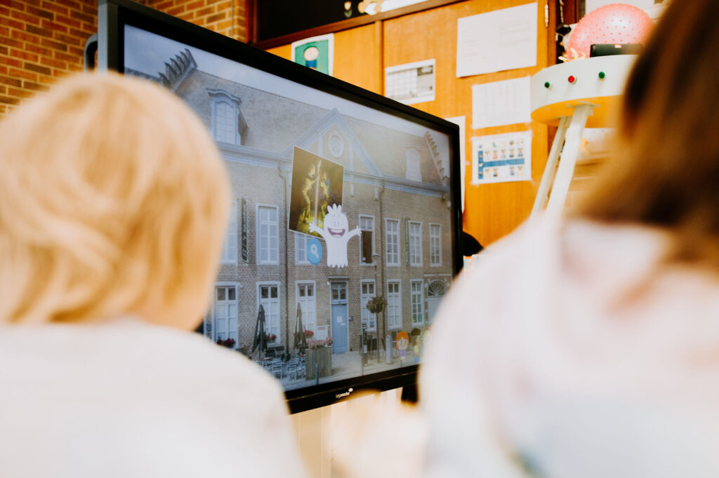 - Op het einde komen de kleuters terug aan de gevel van het cultuurhuis uit en klikken ze op de affiche van de schoolvoorstelling.