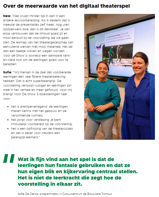 Voor De Show is een interactief, digitaal spel om jouw leerlingen warm te maken voor [titel voorstelling]. Tijdens één lesuur leren je leerlingen over theatercodes, krijgen een virtuele rondleiding in ons cultuurhuis en stelen zelf de show met creatieve opdrachten (tekenen, schrijven of uitbeelden). En dat alles met een minimale voorbereidingstijd. In de klas start je het spel eenvoudig via het digibord of via de laptop en de projector. Vanaf dan wijst het theaterspookje Theo de weg. Ook voor de kleuters is er een aangepaste versie. Klaar voor de show? Tot binnenkort!