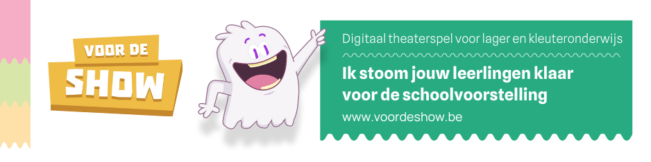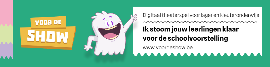 Zet voor de schoolvoorstelling de roll-up banner in jullie inkomhal, foyer of zaal. Op deze manier geef je Voor De Show en het spookje Theo een gezicht in jouw cultuurhuis. Een leuke knipoog naar de leerlingen en leerkrachten die ermee aan de slag gingen in de klas én een slimme teaser voor de klassen die Voor De Show (nog) niet kennen. Afmetingen: 85 x 200 cm // Kostprijs: €45 – Ga zelf aan de slag met het Canva-sjabloon