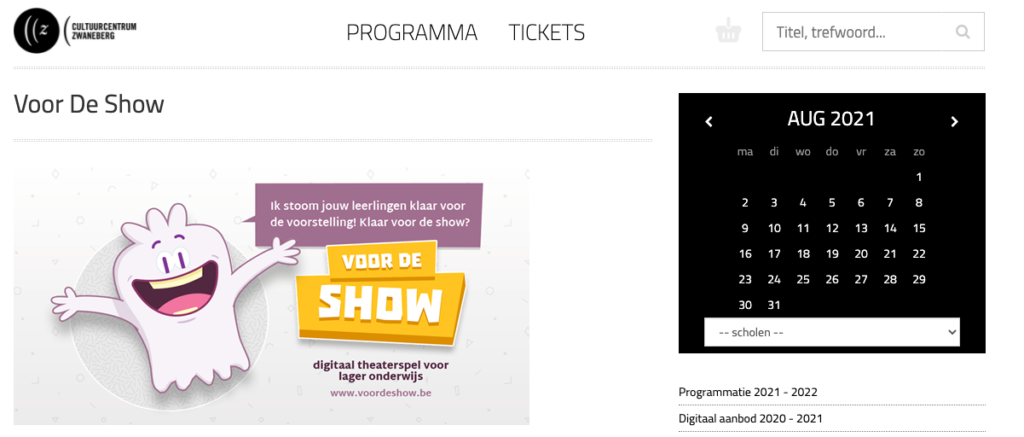 We gingen op bezoek bij Juf Kim in de 1ste en 2de klas van de Sint-Carolusschool (Puurs-Sint-Amands). Met véél enthousiasme en show smeten de leerlingen zich in het theaterspel en in de voorstelling “De Wachters”. Samen namen ze via het digibord een kijkje in het theatergebouw van CC Ter Dilft (Bornem). Ook programmator Bart Wauters werpt een persoonlijke blik op Voor De Show. Download deze video uit de map met gedeeld beeldmateriaal of download rechtstreeks via de deel-knop in de groene balk (onderaan rechts in de Wistia-player).