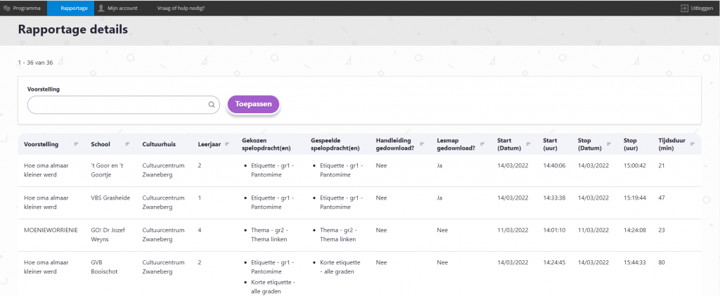 In de applicatie vind je een rapportering over het gebruik van Voor De Show. Klik bovenaan links in de grijze balk op ‘Rapportage’.