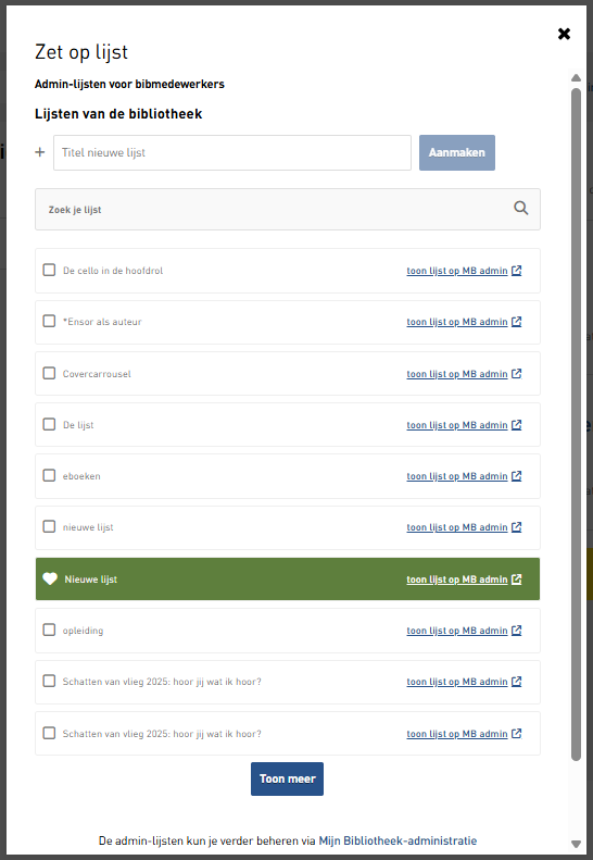 Via ’toon lijst op MB admin’ ga je naar desbetreffende lijst in de Mijn Bibliotheekadministratie.