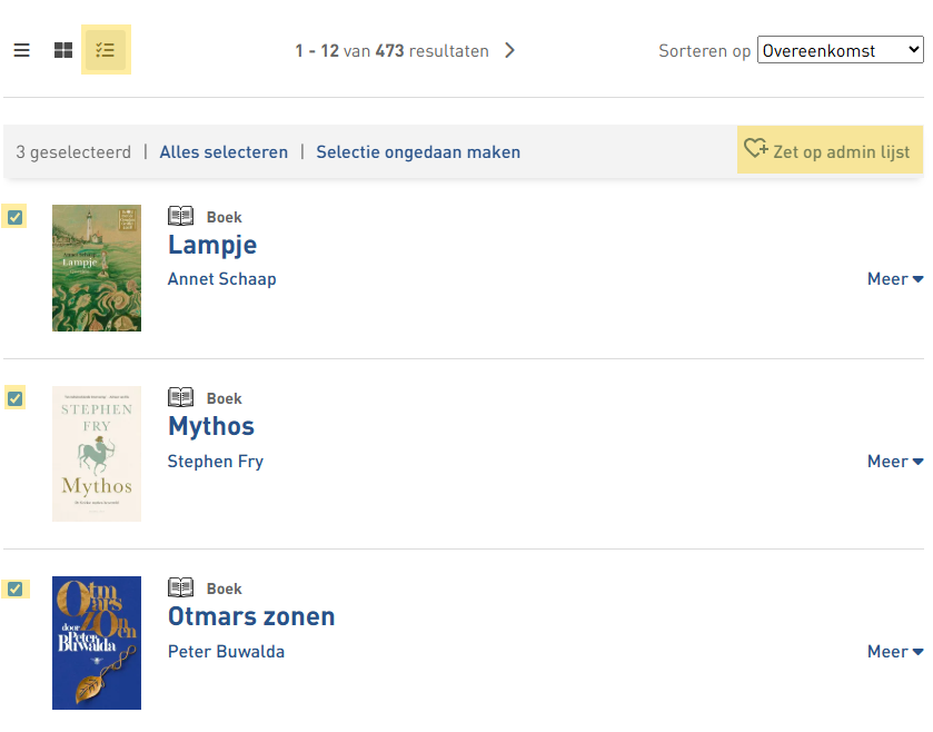 Via de weergave ‘multiselect’ kan je meerdere titels uit een zoekopdracht tegelijkertijd op een lijstje plaatsen.
