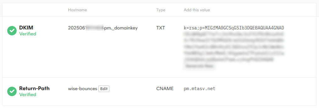 Als de DNS records aan het domein zijn toegevoegd kan Wise de mail met DKIM ondertekenen namens het gebruikte domein, zodat DMARC valideert.