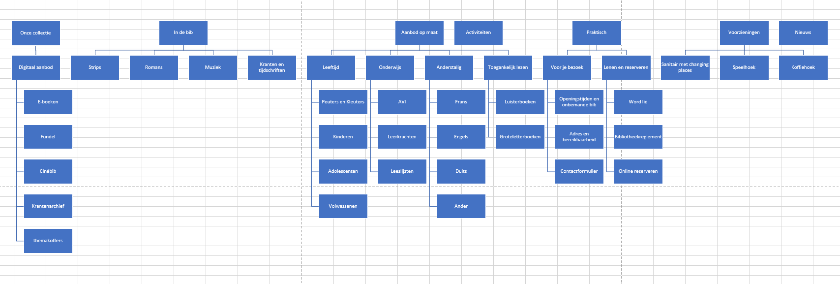 Met een werkgroep samengesteld uit bibliotheekcollega’s kwamen we uit op onderstaand model voor een gedeelde menustructuur en -labels (workshops voorjaar 2025).