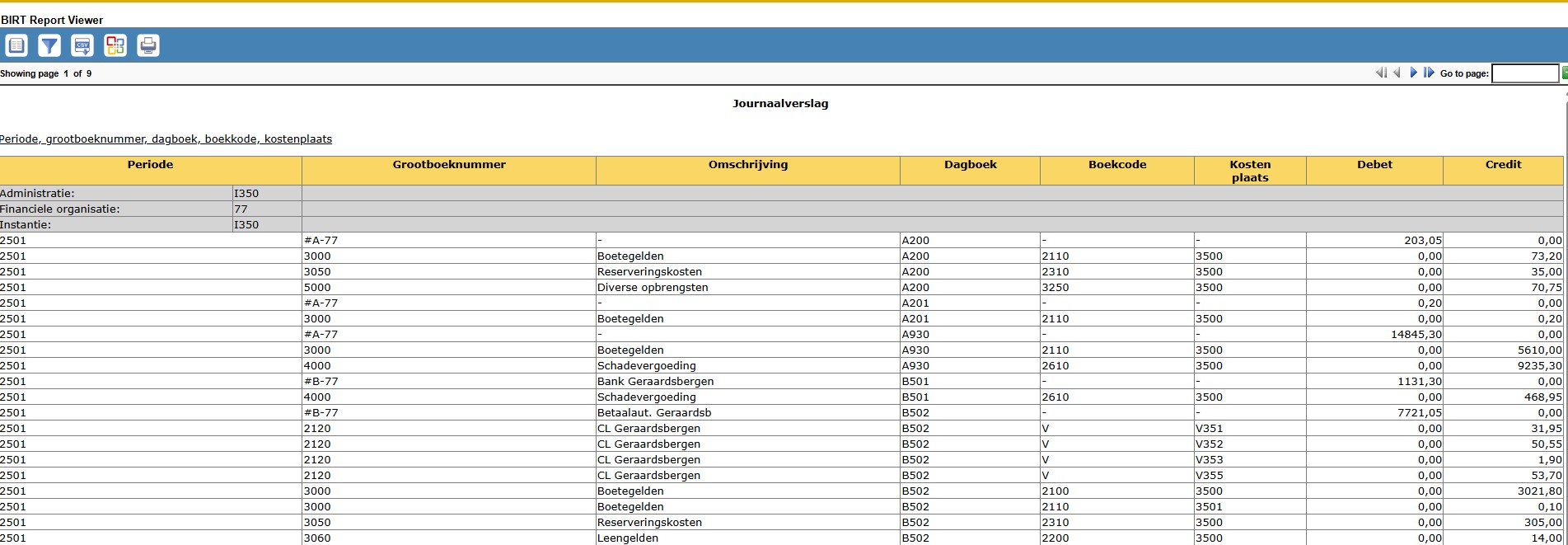 De velden zijn periode, grootboeknummer (dat is een intern boekhoudnummer van Wise waarover zometeen meer), de omschrijving van het grootboeknummer, het dagboek (de code van de kassa of bank waar het bedrag is ontvangen), de boekcode (de soort kost), de kostenplaats, debet (wat andere organisaties voor jouw bib hebben ontvangen) en credit (wat jouw bib ontvangen heeft voor andere organisaties). Exporteer dit rapport naar Excel.