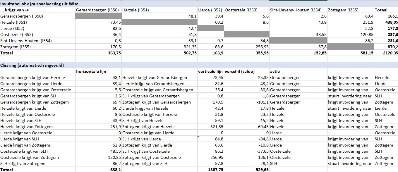 Beide sjablonen bevatten bovenaan een invultabel. In onderstaand voorbeeld: Bib Geraardsbergen (I350) moet hier 73,45 euro aan bib Herzele (V351), 82,60 euro aan bib Lierde (V352), 36,40 euro aan bib Oosterzele, 0,80 euro aan bib Sint-Lievens-Houtem (V354) en 170,50 euro aan bib Zottegem (V355). Je tikt deze bedragen over uit het journaalverslag in de Excelsheet, per kolom.