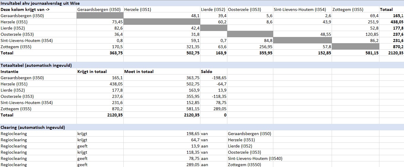 Onder de tabel (onderstaand voorbeeld is een sjabloon voor clearing via de regio) wordt berekend wat jouw bib in totaal aan alle andere bibs moet en wat jouw bib in totaal van alle andere bibs krijgt. De regio treedt hier op als clearing partner zodat je onderling geen facturen hoef te sturen: de regio zal jouw bib een bedrag factureren of een bedrag storten. Het saldo van de totale clearing is altijd 0 dus de regio is enkel een doorgeefluik. Dit is zeer handig en veroorzaakt veel minder betalingsverkeer dan onderlinge clearing per bib!