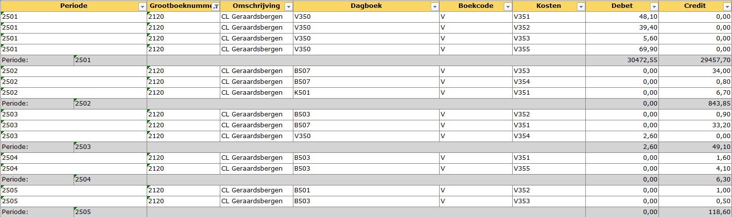 Zet de kolommen en rijen goed in Excel. Verwijder de eerste twee rijen zodat je bovenaan enkel kolomhoofdingen hebt. Zet een autofilter op de kolommen. Selecteer in de filter van het Grootboeknummer enkel het nummer 2120. Hiermee wordt het verslag beperkt op de clearing lijnen (bv. CL Geraardsbergen) en krijg je een overzicht van wat andere bibs hebben ontvangen voor jou (credit = ben je verschuldigd) en wat jouw bib heeft ontvangen voor andere bibs (debet = heb je tegoed). Vink je in de kolom Grootboeknummer ook de lege cellen aan, dan krijg je hetzelfde overzicht per instantie per maand: