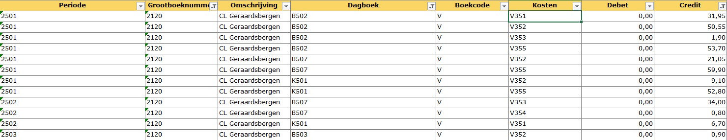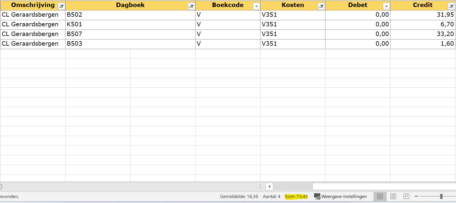 Tip: Maak je het journaalverslag voor verschillende maanden tegelijk, dan worden de creditlijnen in het journaalverslag uitgesplitst per maand. Voor het juiste bedrag in de tabel moet je dan de cellen van dezelfde kostenplaats samentellen per maand (tip: je kan filteren op Omschrijving en Kostenplaats, en je kan cellen in Excel samen selecteren met Ctrl en onderaan in de Excelbalk de som zien).