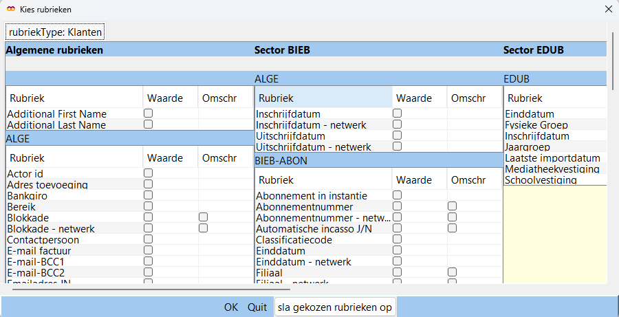 Als je settype: klanten kiest en vervolgens selecteert op een exemplaar-rubriek dan wordt gekeken naar alle exemplaren die een klant ooit uitleende (voor zover niet geanonimiseerd).