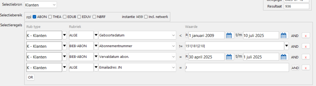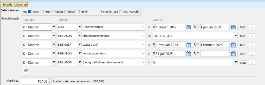 AND Klanten: Bieb-abon: Abonnementnummer != …. (selecteer in de dropdown de uit te sluiten abonnementsoorten, hou shift ingedrukt om meerdere te selecteren)