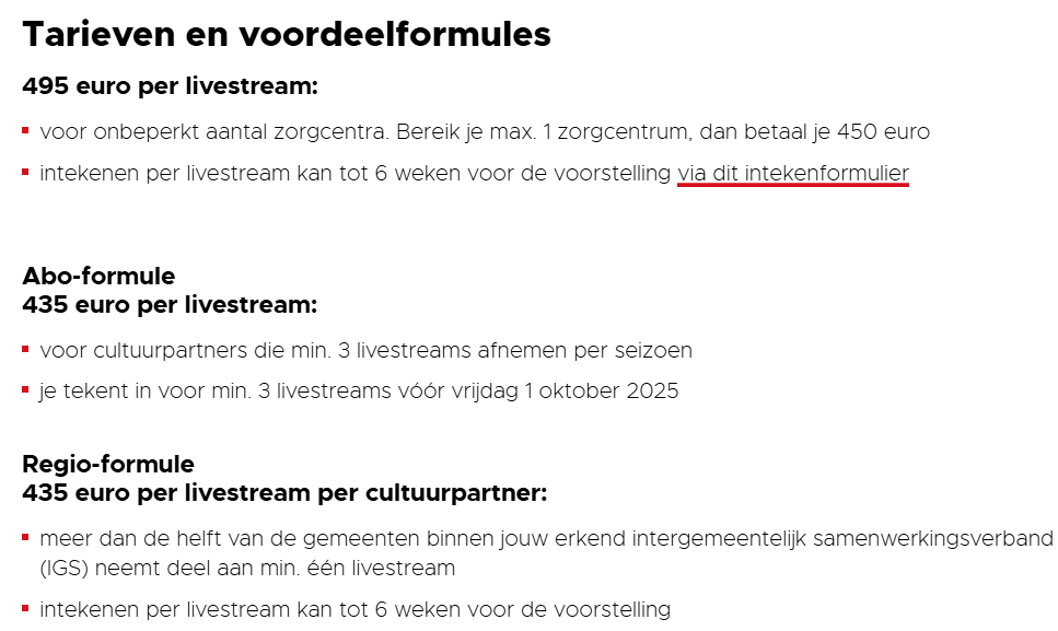 De financiële bijdrage voor de livestream wordt gedragen door de lokale cultuurpartner. De tarieven en voordeelformules vind je terug op onze website.