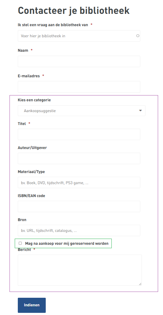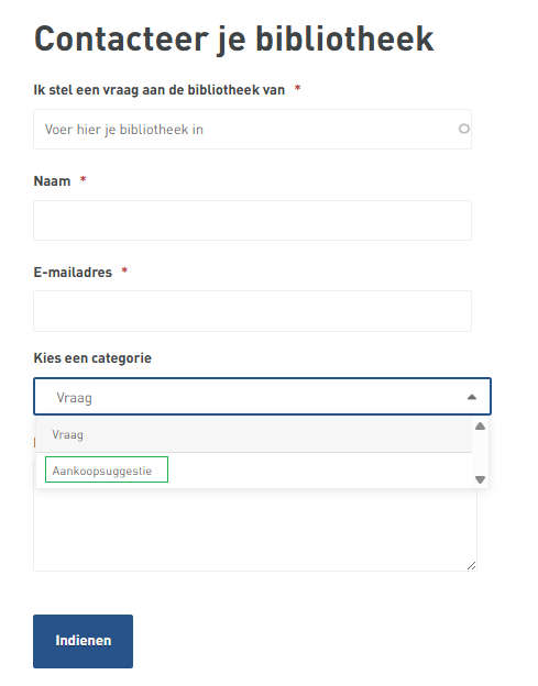 Op het default contactformulier (terug te vinden rechtsboven elke bibliotheekwebsite) is een categorie ‘aankoopsuggestie’ voorzien.