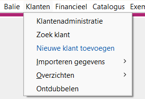Heb je de Klantenadministratie geopend, bijvoorbeeld om eerst de klant op te zoeken op naam, dan kan je ook via het submenu “Klant” kiezen voor “Nieuwe klant toevoegen”