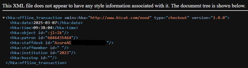 In dat mapje zal in eerste instantie enkel een submap todo zitten. Daarin vind je, per datum en per uur, onverwerkte transacties in de vorm van xml-bestanden. Je kan deze openen in kladblok om de inhoud te bekijken. Zo zie je de lener (hier: patron id, fictief) staan en het exemplaar (hier: object id, fictief) maar ze zijn geen bruikbaar hulpmiddel om de noodbestanden te gaan verwerken. Wel kan je, indien nodig, de gegevens controleren die werden ingegeven bij het starten van de noodprocedure: de datum, tijd, poort (hier: staffdesk id), de vestiging (hier: institution id).
