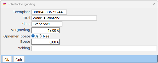 De vergoeding is in principe de prijs van het exemplaar en kan je hier eventueel nog aanpassen.
